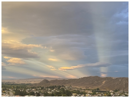 'Hi James, a rapidly-changing and rather hectic sky this morning at 06:51 with a humid morning and a few spots of rain in the afternoon, but the washing still dried on the lime. Taken on my Samsung A33 19 February 2026 looking north past Mt Campbell and a tad east towards Motueka. Best wishes, Stephanie.'