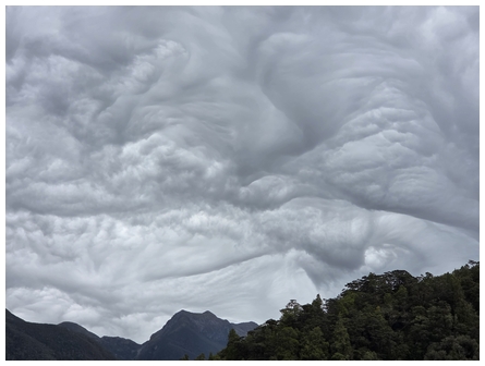 'Hi James, a rapidly-changing and rather hectic sky this morning at 06:51 with a humid morning and a few spots of rain in the afternoon, but the washing still dried on the lime. Taken on my Samsung A33 19 February 2026 looking north past Mt Campbell and a tad east towards Motueka. Best wishes, Stephanie.'